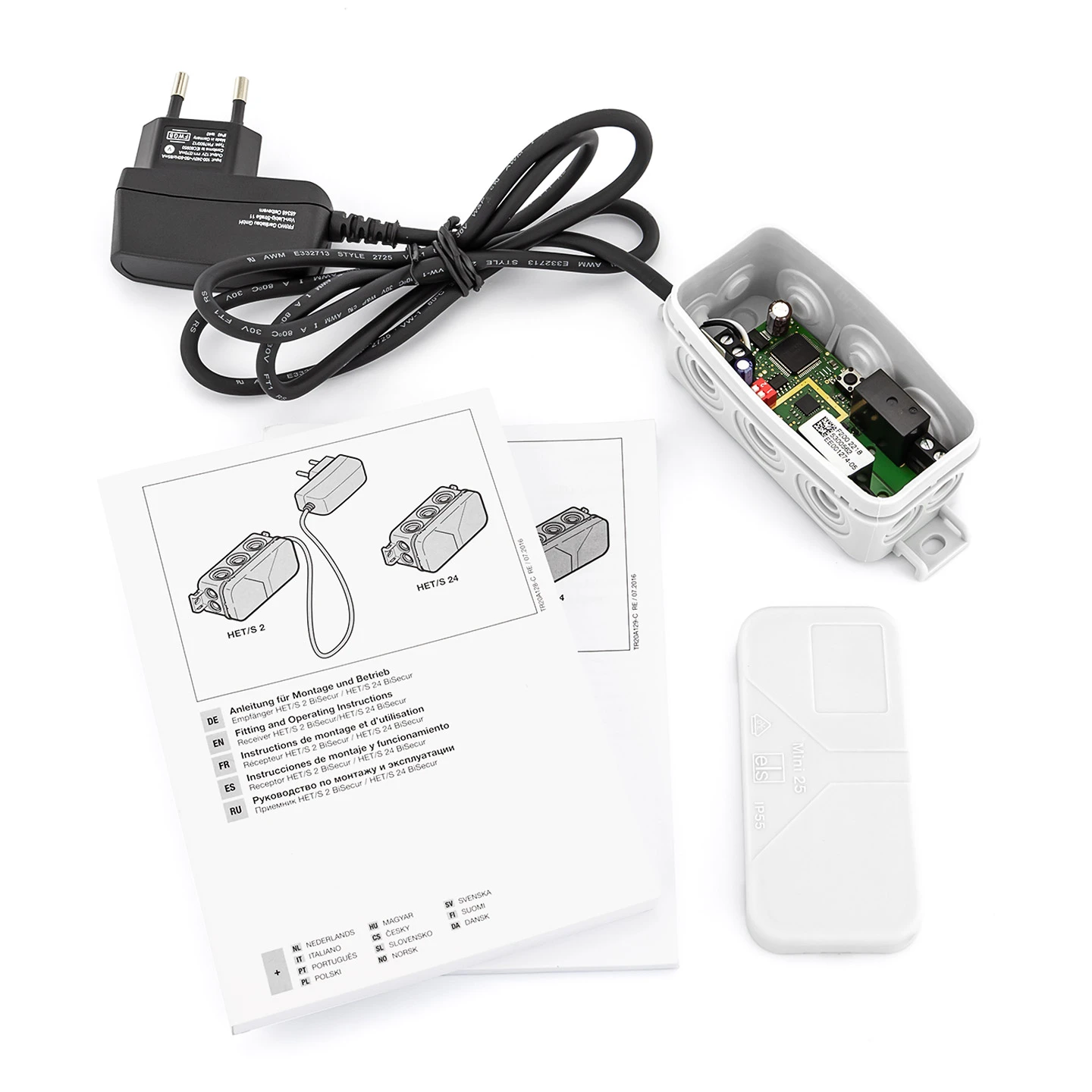 Der Funkrelais-Empfänger HET/S 2 unterscheidet sich vom HET/S24 nur durch das zusätzlich mitgelieferte Steckernetzteil. Somit kann der HET/S 2 sofort an eine Netzsteckdose zur Stromversorgung angeschlossen werden. Der HET/S 24 ohne Netzstecker benötigt dagegen eine 12 – 24 V Niederspannungsquelle, wie sie zum Beispiel an bestimmten Torantrieben vorhanden ist.