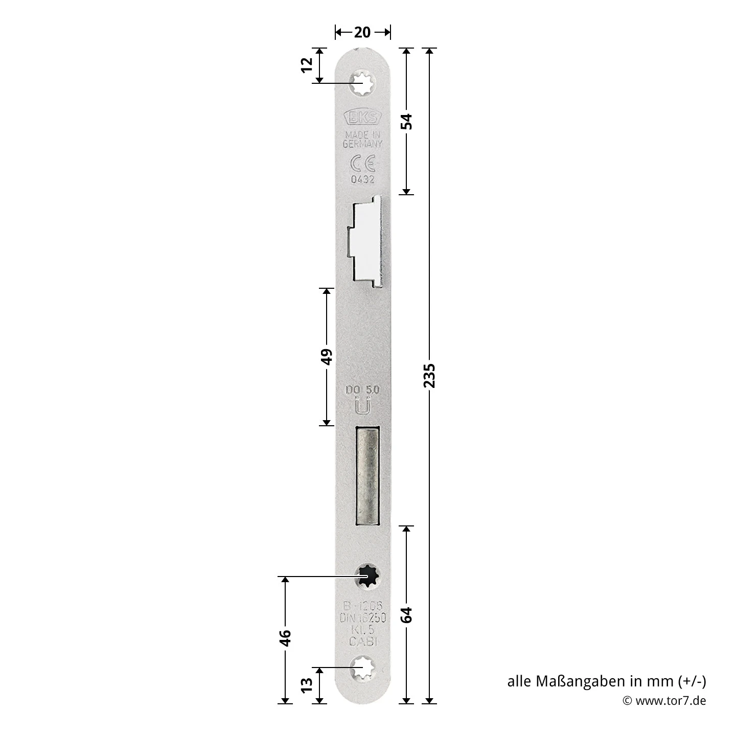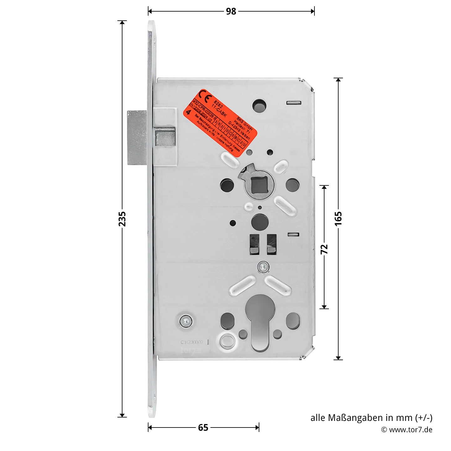- Entfernung (Mitte Drückervierkant bis Mitte Schlüsselloch): 72 mm