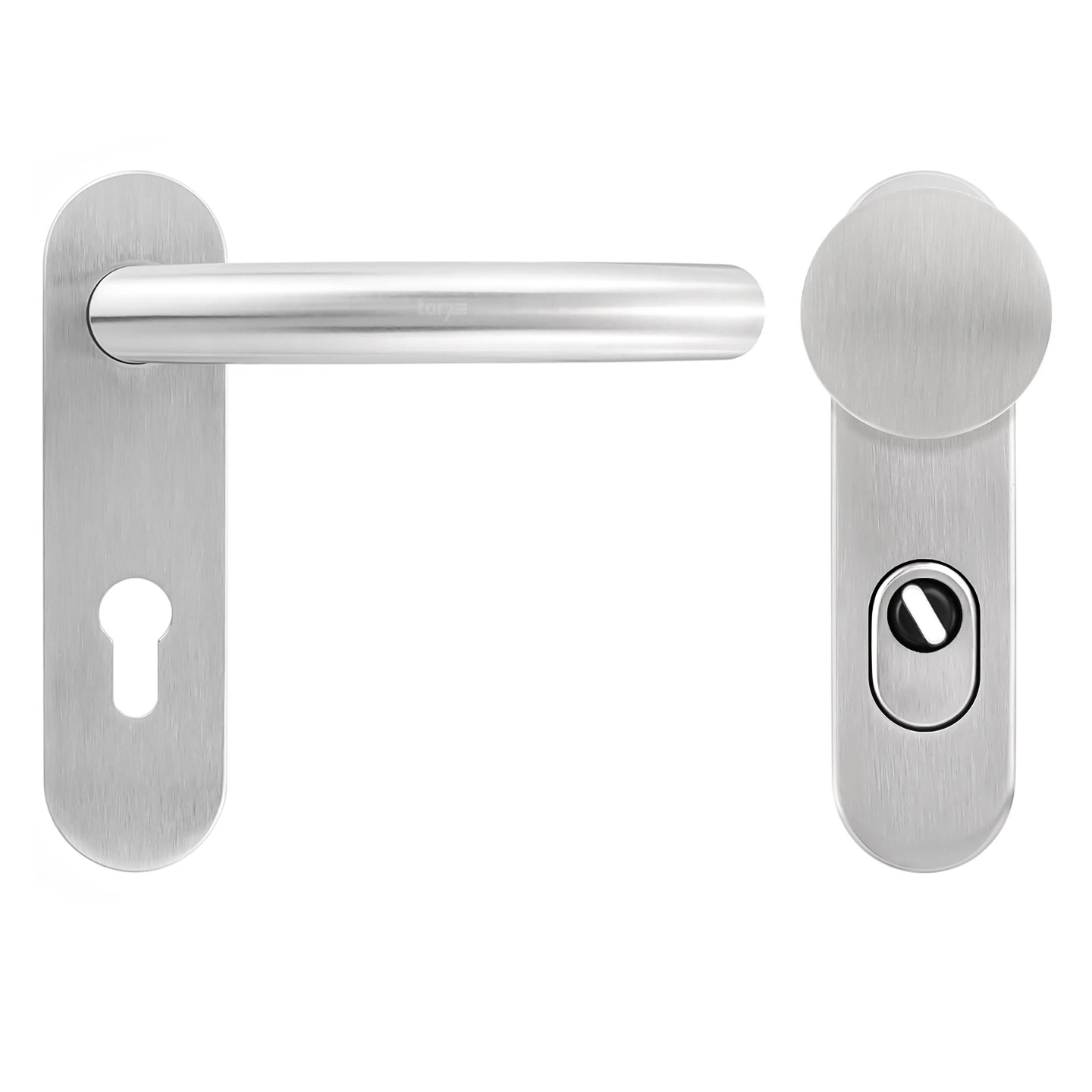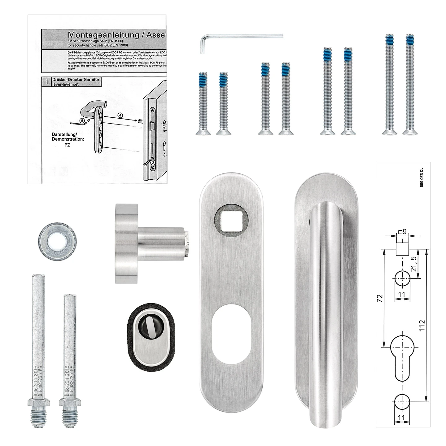 Der Steinau FS ES1-K Sicherheitsbeschlag, Typ D 510, Edelstahl matt bietet Einbruchssicherheit der Klassifizierung ES1 / Klasse 2 und ist somit Teil der Sicherheitsvorrichtungen an Türen. Diese hochwertige Garnitur wird als Wechselgarnitur geliefert und ist mit Zylinderziehschutz ausgestattet. Der formschöne Drücker wird als Typ 510 und der Außenknauf als massiver Knopf K-135 ausgeführt. Das abgerundete Kurzschild wird mit stabiler Stahlunterkonstruktion mit Stütznocken geliefert. Durch die durchgehende Verschraubung der Grundplatte ist ein dauerhaft stabiler und sicherer Sitz gewährleistet. Verwenden können Sie die Garnitur an links oder rechts angeschlagenen Holz- und Stahltüren mit einer Türblattstärke von 40 bis 66 mm, sowie an Sicherheitstüren der Widerstandsklasse RC2. Auch die Montage an Feuer- und Rauchschutztüren ist durch die gültige Prüfung nach DIN 18273 ohne Einschränkungen möglich. Der Drücker ist festdrehbar im wartungsfreiem Gleitlager aus selbstschmierenden Kunststoff gelagert und sorgt so für einen gleichbleibend hohen Bedienkomfort auch bei höherem Nutzungsaufkommen. Das hochwertige, matt gebürstete Edelstahl 1.4301 und das ansprechende Design sorgen für eine harmonische Türansicht.